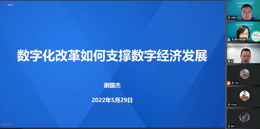 5月30日晚,嘉兴学院永利3044官网唯一、嘉兴市经济学会、嘉兴市高层次人才联谊会以线上会议形式联合举办第1期“南湖数字经济讲堂”。数字浙江技术运营有限公司项目总监、解决方案架构师、省重点实验室方向负责人谢国杰先生应邀作学术报告,永利3044官网唯一副院长李亚主持,我校多名师生参与了线上研讨。