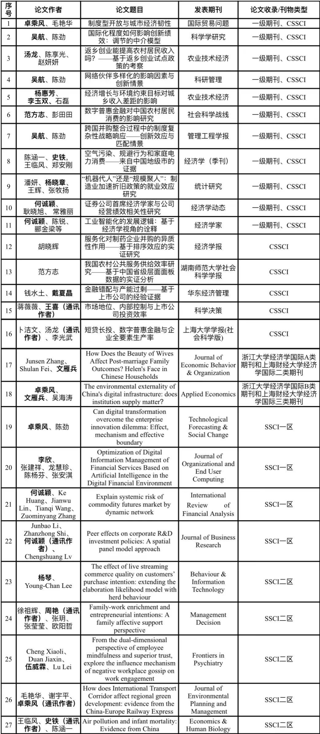 在学校正确指导和大力支持下,在学院全体教师共同努力下,初步统计,2023年我院教师独立或合作在《经济学(季刊)》《统计研究》《国际贸易问题》《农业技术经济》《科研管理》,以及Journal of Economic Behavior & Organization、Applied Economics、Management Decision等国内外知名期刊上发表高水平学术论文32篇,其中,中文社会科学引文索引(CSSCI)期刊论文16篇(含中文一级期刊论文11篇)、SSCI/SCI收录论文16篇。