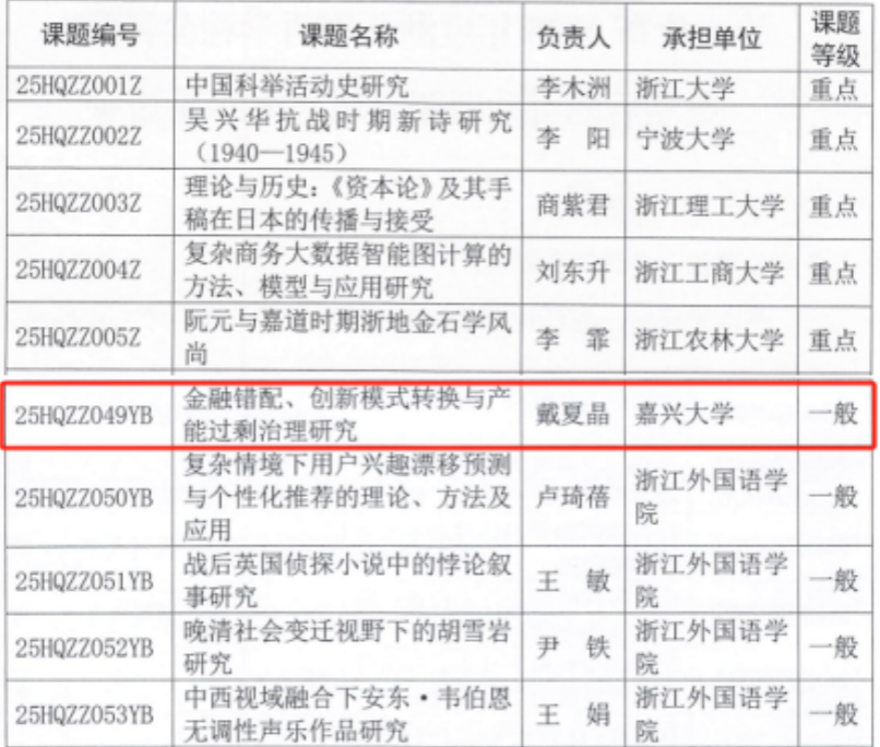 近日,浙江省哲学社会科学工作办公室发布了《关于公布2025年度浙江省哲学社会科学规划后期资助课题立项名单的通知》,我院戴夏晶老师主持申报的《金融错配、创新模式转换与产能过剩治理研究》项目获批立项。