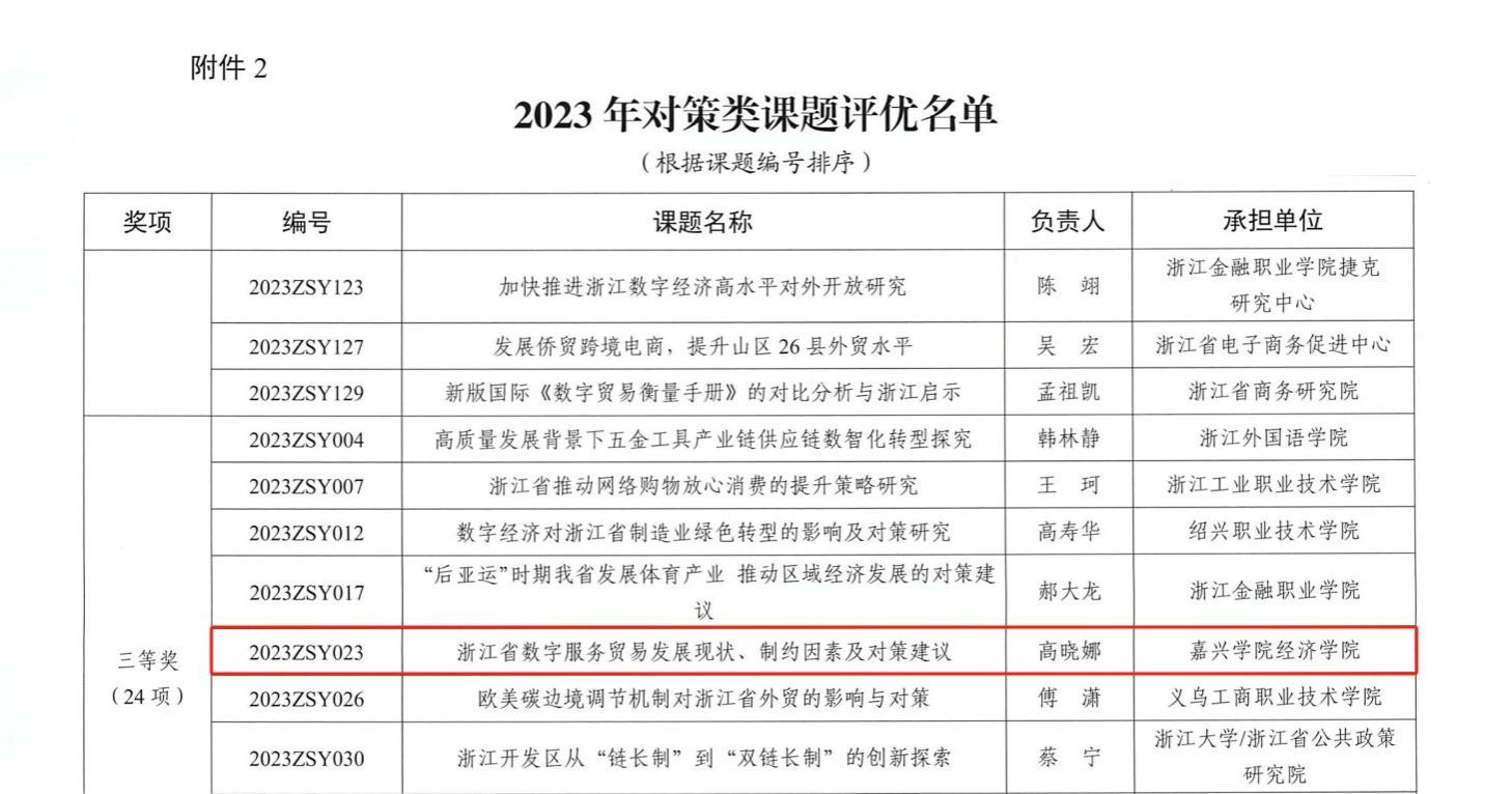 近日,浙江省商务厅发布《浙江省商务厅关于公布2023年度对策类课题及国际经济贸易研究优秀成果名单的通知》(浙商务发〔2023〕93号),我院高晓娜博士、李萍副教授主持完成的两项课题顺利结项,其中高晓娜博士主持的《浙江省数字服务贸易发展现状、制约因素及对策建议》获2023年对策课题三等奖;文雁兵教授和卓乘风博士的合作成果《从政策性开放走向制度型开放:内在逻辑、路径选择与效果评估》获2023年国际经济贸易研究优秀成果三等奖。