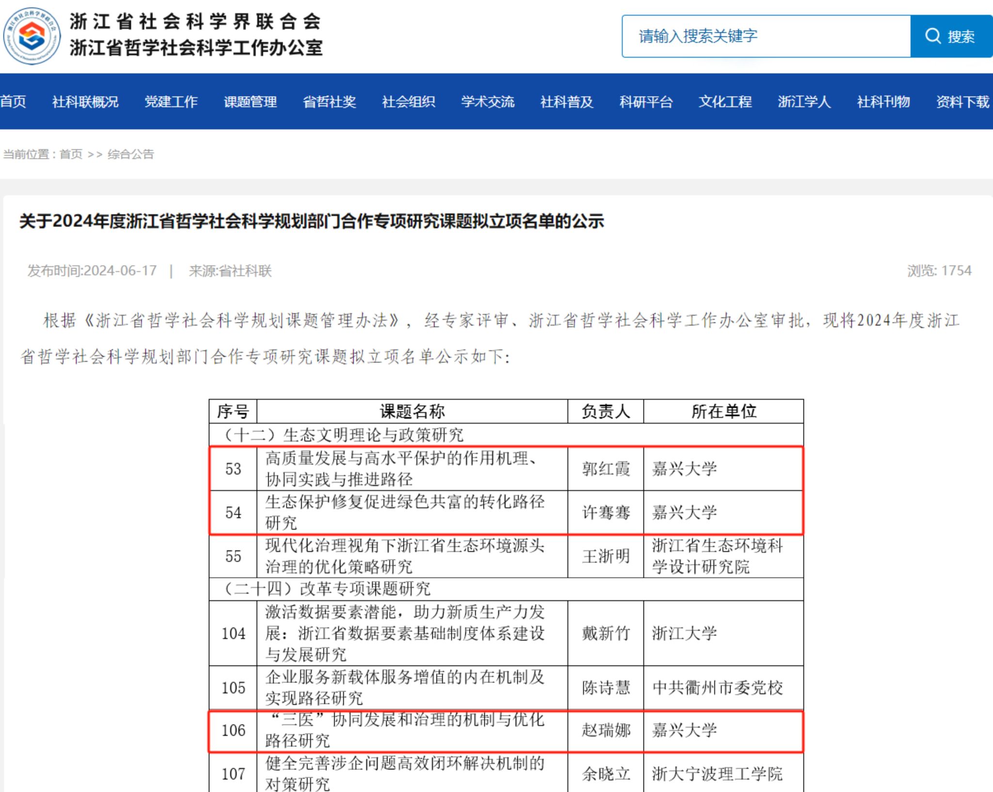 近日,浙江省哲学社会科学工作办公室公布了《关于2024年度浙江省哲学社会科学规划部门合作专项研究课题拟立项名单的公示》。我院郭红霞博士主持的课题《高质量发展与高水平保护的作用机理、协同实践与推进路径》、许骞骞博士主持的课题《生态保护修复促进绿色共富的转化路径》、赵瑞娜博士主持的课题《“三医”协同发展和治理的机制与优化路径研究》获得拟立项。