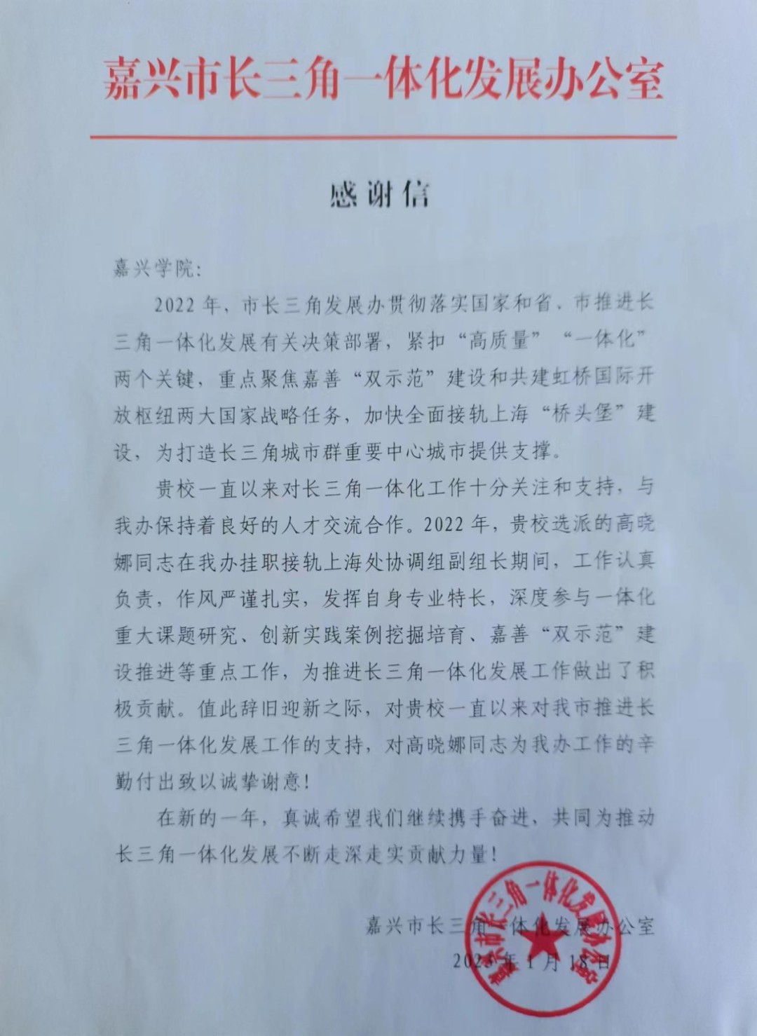 近日,嘉兴市长三角一体化发展办公室发来感谢信,对我院挂职教师高晓娜博士表示感谢和提出表扬。
