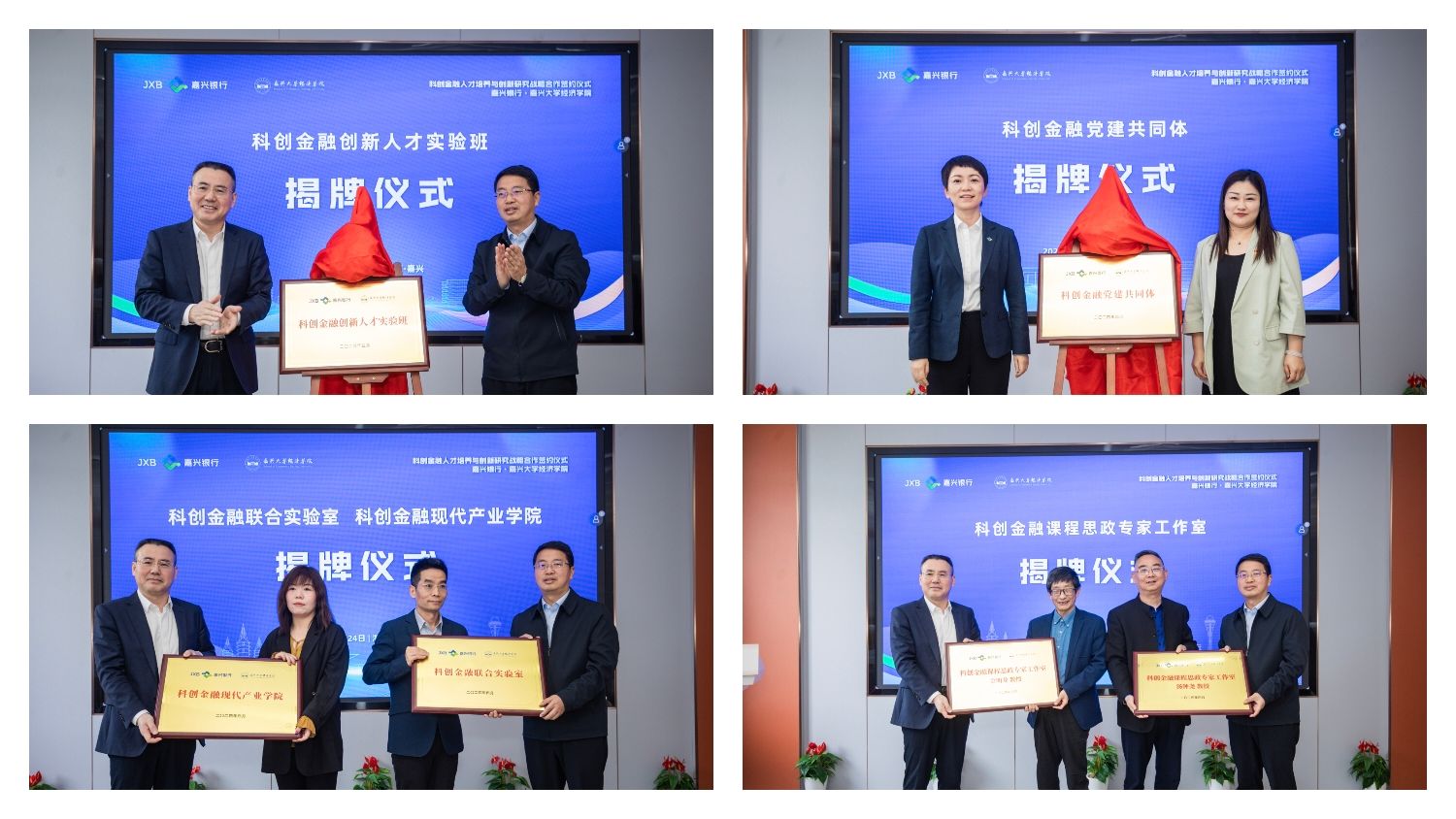 副校长於建明和嘉兴银行党委副书记、行长章张海共同为“科创金融创新人才实验班”揭牌,并为“科创金融联合实验室”“科创金融现代产业学院”“科创金融课程思政专家工作室”进行授牌。学院党委书记蔡运男和嘉兴银行党委副书记、副行长王芳共同为“科创金融党建共同体”揭牌。