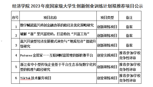 根据学校教务处《关于开展嘉兴学院国家级大学生创新创业训练计划2023年度项目申报的通知》要求,学院组织开展了项目申报工作。经项目组申报、学院组织专家评审,拟推荐3个项目为2023年度国家级大学生创新创业训练计划备案项目,拟推荐3个项目参加学校组织的竞争性评审,现予以公示。