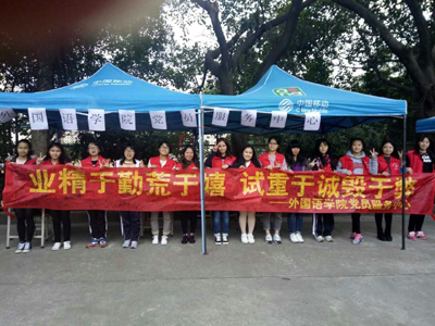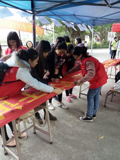 12月14日,大学英语四六级考试前夕,外国语学院党员服务中心在足球场旁举办了诚信考试签名活动。活动主题为:业精于勤荒于嬉,试重于诚毁于弊。