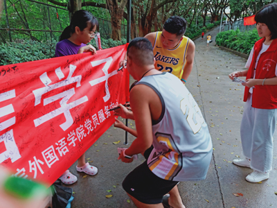 (通讯员:吴丽婷)6月18日,外国语学院党总支举办主题为“树诚信考风做诚信学子”的签名活动,积极响应学校诚信主题教育活动,严肃考风考纪,培育优良学风和校风。外国语学院党员服务中心志愿者们协助组织,全校学子纷纷响应。