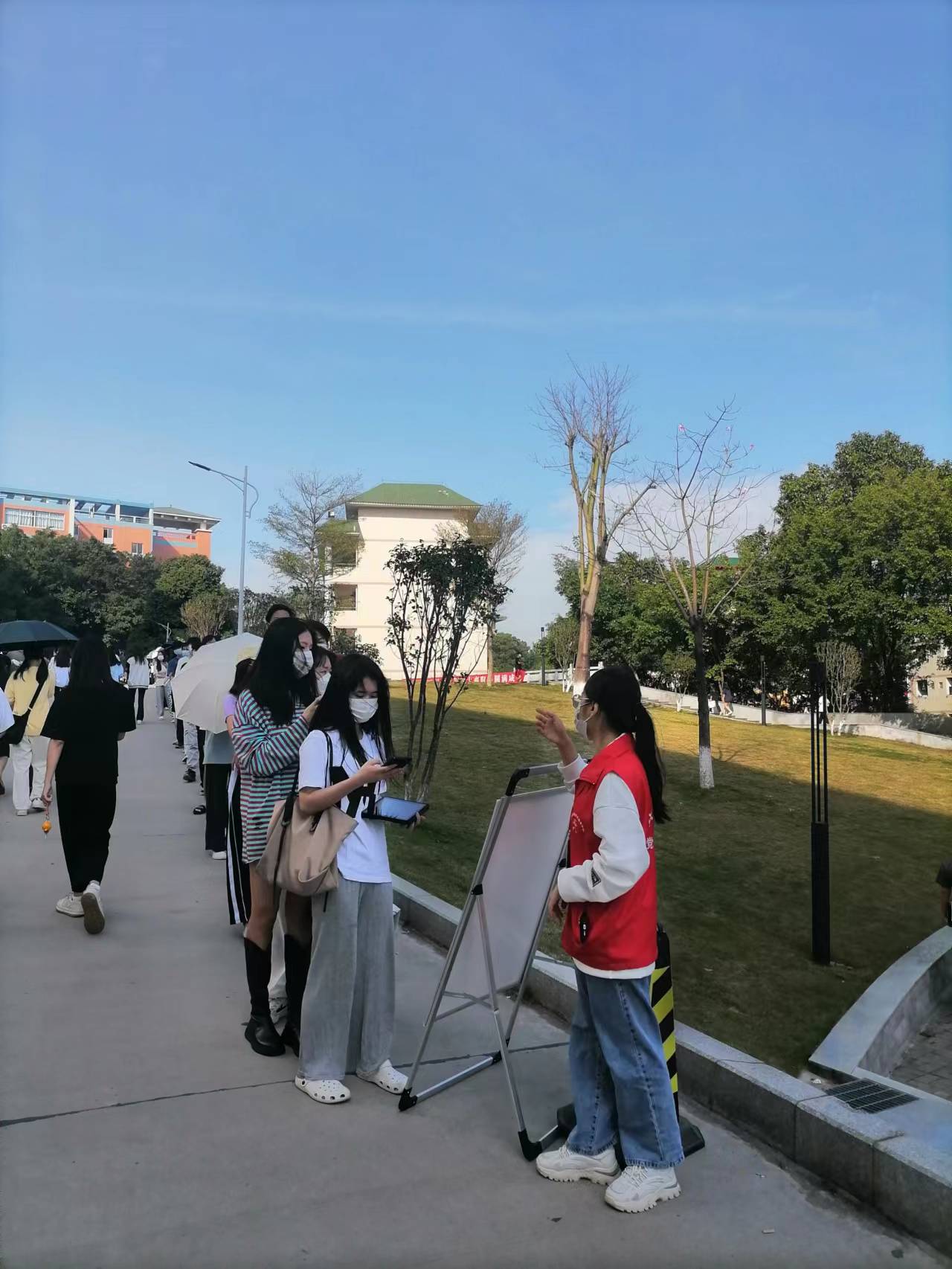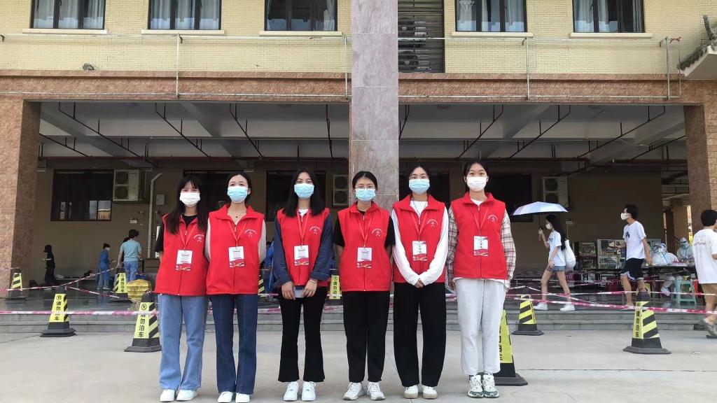 “请大家佩戴好口罩,依次排队,保持一米以上安全距离;请提前出示粤核酸码,方便工作人员录入信息……,在核酸采样现场,我院志愿者们积极引导同学们有序排队,全力营造一个有序、高效的检测环境。维护队伍秩序、提醒师生们扫场所码、引导师生有序前往核酸检测通道,这些都有效保证了核酸检测工作高效、有序地进行。