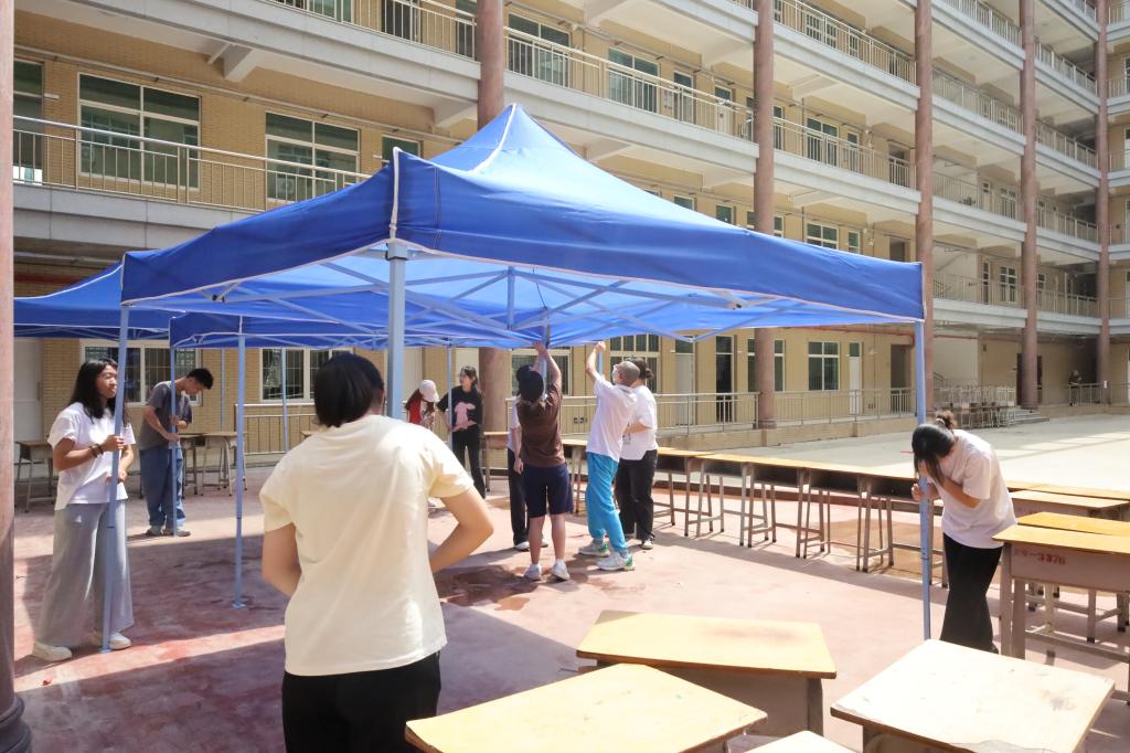骄阳似火,外国语学院的老师们和志愿者们齐心协力,有秩序、有计划地布置着迎新现场。到达经管楼后,大家分工明确,相互配合,认真地将桌椅运送并整齐摆放在预定位置、搭建迎新帐篷、展挂横幅、排布班级指示牌;精心、细心布置好了次日迎新需要用到的教室,仔细检查各项工作细节。老师们与志愿者们将“真诚”与“真心”融入到工作的每个细节。大家配合默契,不怕苦不怕累,高效地完成了迎新场地布置,为2023级新生们营造了一个温馨、规范、有序的迎新环境。