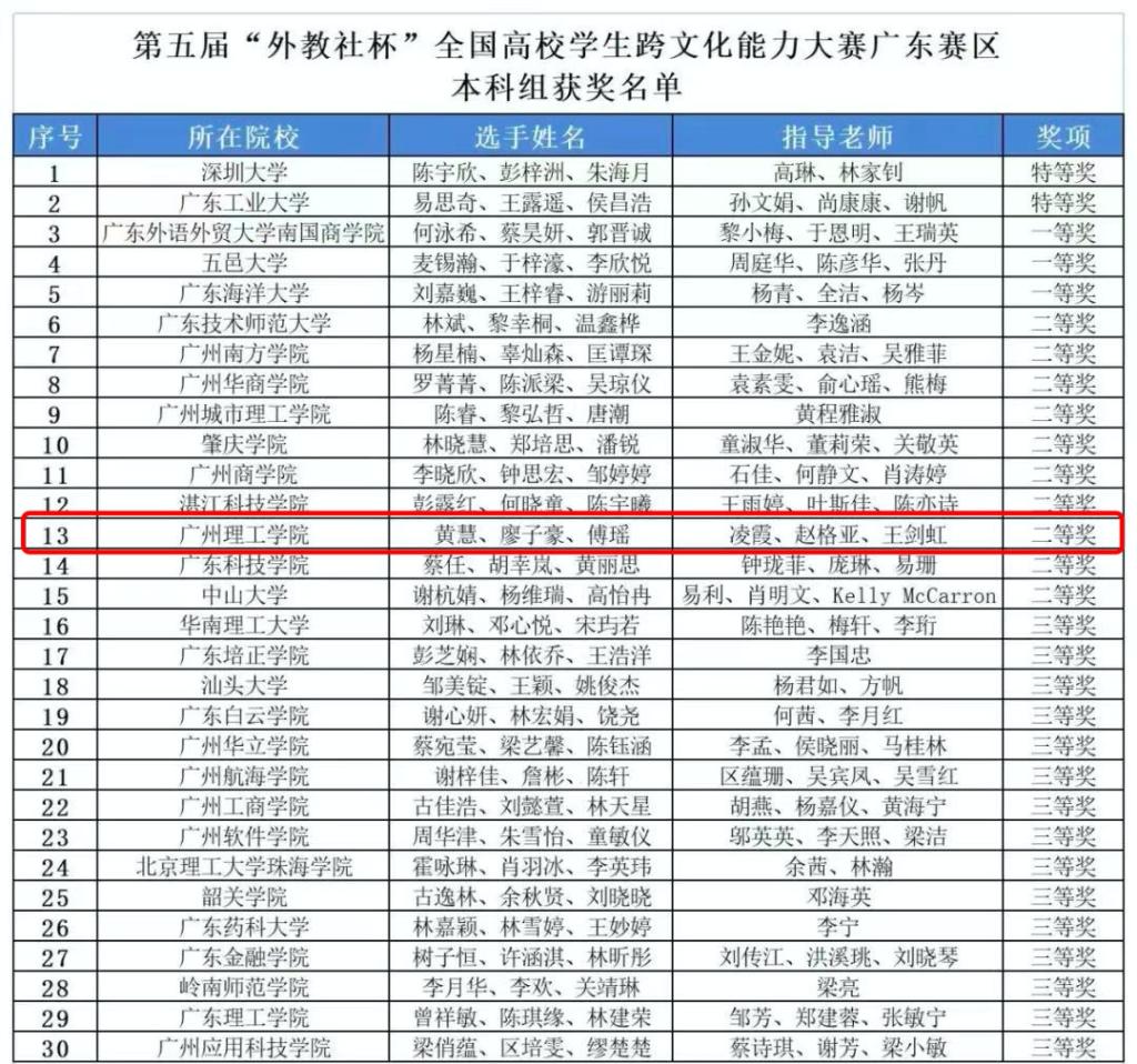 12月4日,第五届“外教社杯”全国高校学生跨文化能力大赛(广东赛区)决赛落下帷幕。我校学生黄慧(外国语学院)、廖子豪(计算机科学与工程学院)和傅瑶(工商管理学院)在凌霞、赵格亚和王剑虹老师的指导下,在本次大赛中斩获二等奖的优异成绩。