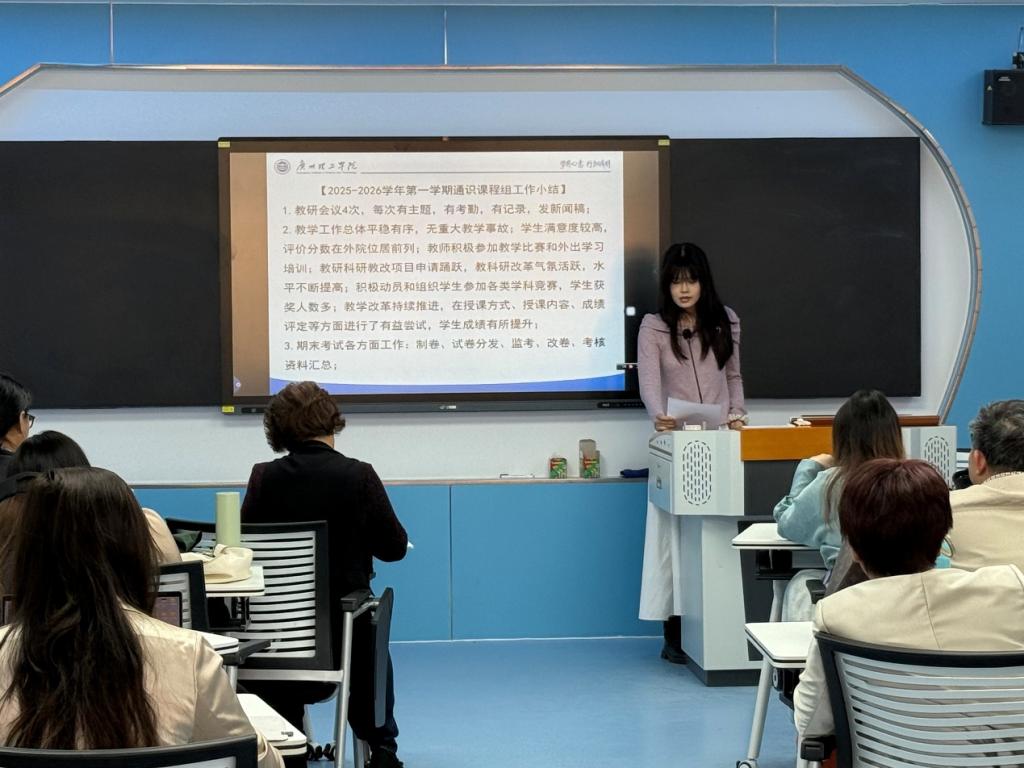 本次会议主要围绕上学期课程组工作总结和近期重点工作部署等议题展开。会议伊始,马助理宣布了将由翟俊丽老师担任通识课程组组长的通知。随后,翟俊丽老师作任职发言。她对学院的信任与各位老师的支持表示诚挚感谢,并表示此次任职既是责任也是锻炼机会,今后她将积极与各方沟通协调,扎实推进课程组各项工作,与全体教师携手推动课程组发展再上新台阶。马助理随即代表课程组,对上一任组长郑雨娴老师的辛勤付出表示衷心感谢,肯定其为课程组规范化建设、教学质量稳步提升作出的重要贡献,并期待在翟组长的带领下,通识课程组各项工作实现新突破。