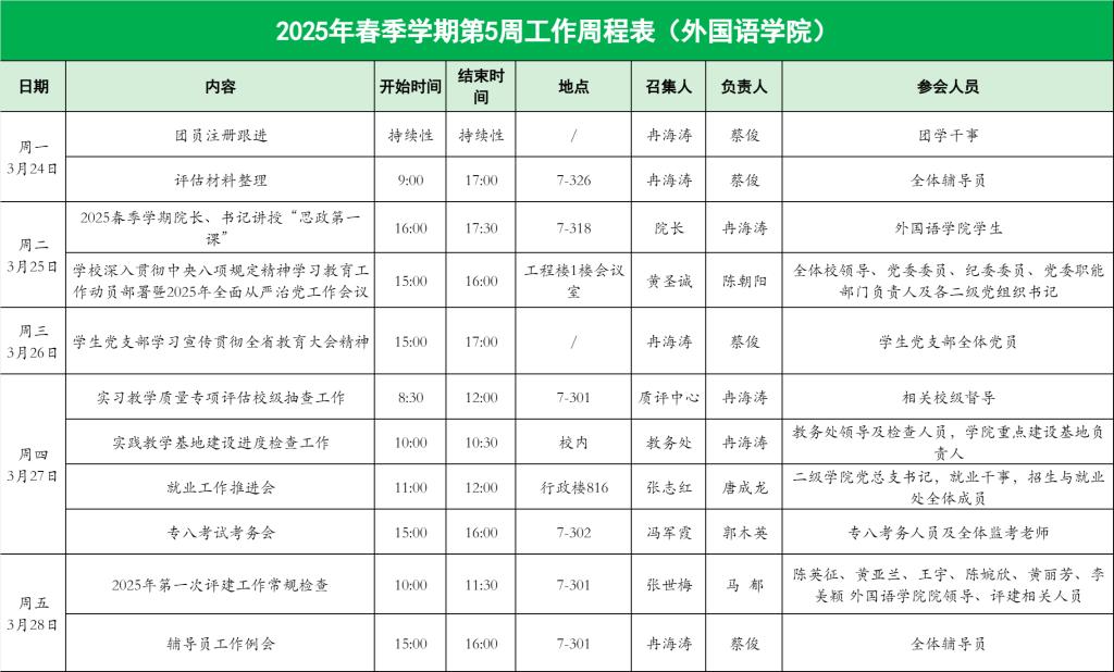 外国语学院2025年春季学期第5周工作周程表