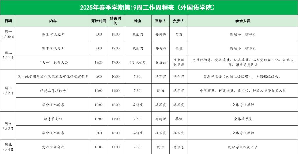 外国语学院2025年春季学期第19周工作周程表