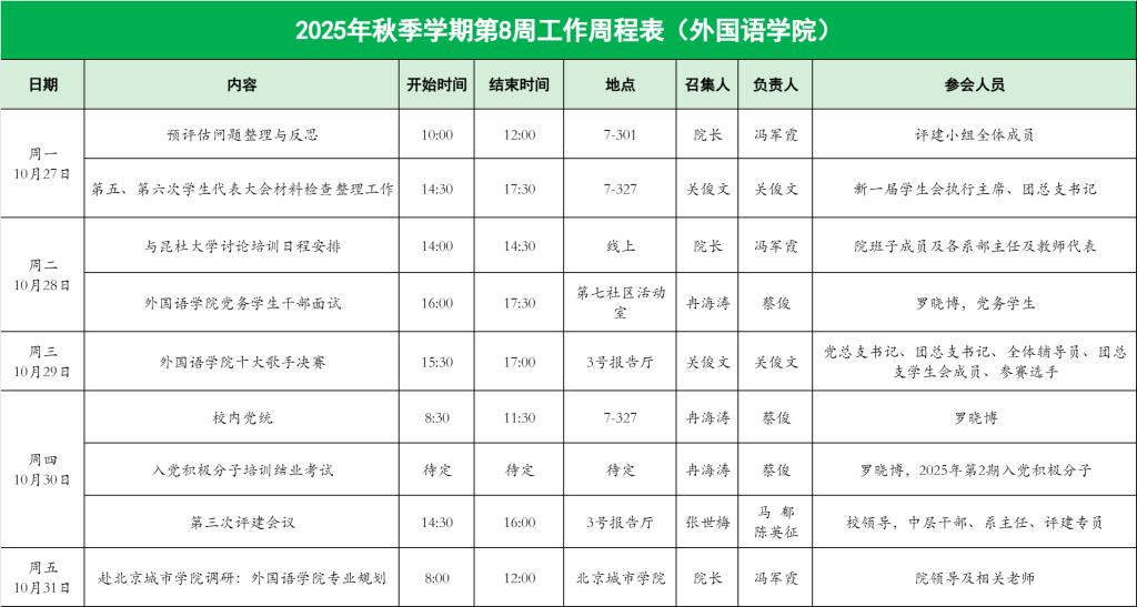 外国语学院2025年秋季学期第8周工作周程表