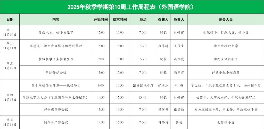 外国语学院2025年秋季学期第10周工作周程表
