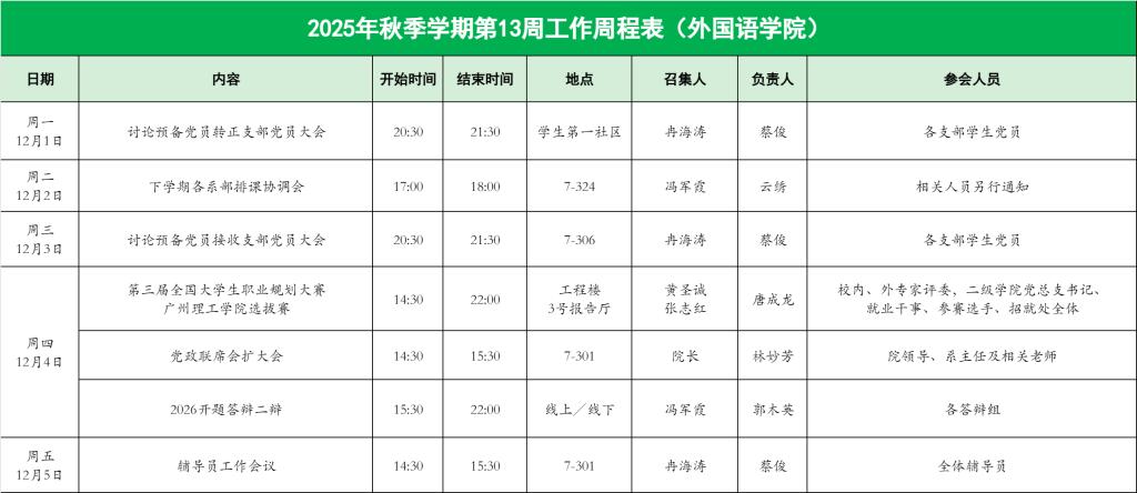 外国语学院2025年秋季学期第13周工作周程表