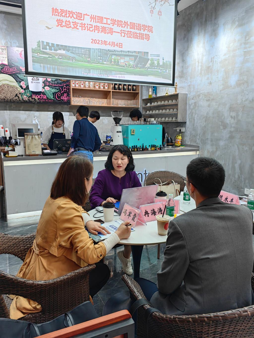 (申丹)4月4日,外国语学院党总支书记兼副院长冉海涛、副院长冯军霞和英语系主任申丹一行前往广东职业技术学院进行招宣访问,广东职业技术学院陶霞副院长、陈木丰副院长予以了热情的接待。在广职院的教学实习基地--悦创咖啡厅,双方就高本衔接三二分段合作、专升本学生报考以及跨校第二课堂的开展等方面进行了卓有成效的交流。