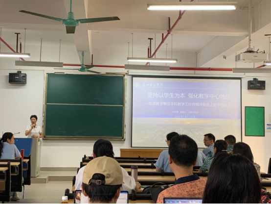 7月19日上午,张世梅副校长和教学管理部陈英征部长在13栋401为外国语学院全体教师做题为《坚持以学生为本,强化教学中心地位》的本科教学工作合格评估宣讲会。