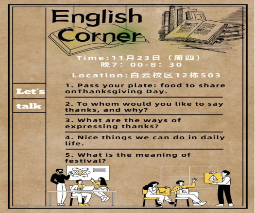 本次活动的主题为“Thanksgiving Day”,旨在丰富学生的英语文化知识,营造良好的协同学习的氛围,提高学生的英语运用能力和交往沟通能力,提升跨文化交际能力和国际竞争力。活动当天,我们邀请了来自华南理工大学的多位外教出席,为参与者带来了精彩纷呈的语言学习体验。
