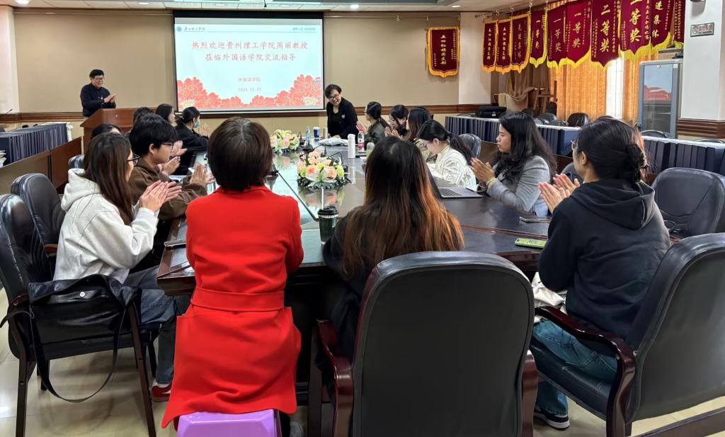12月19日上午,外国语学院特邀贵州理工学院外国语学院院长周丽教授在7栋301会议室开展“基于‘国家一流线上课程’的智慧课程建设及应用”学术讲座。本次讲座由院长韩院长主持。外国语学院冯军霞副院长以及专任教师参与。
