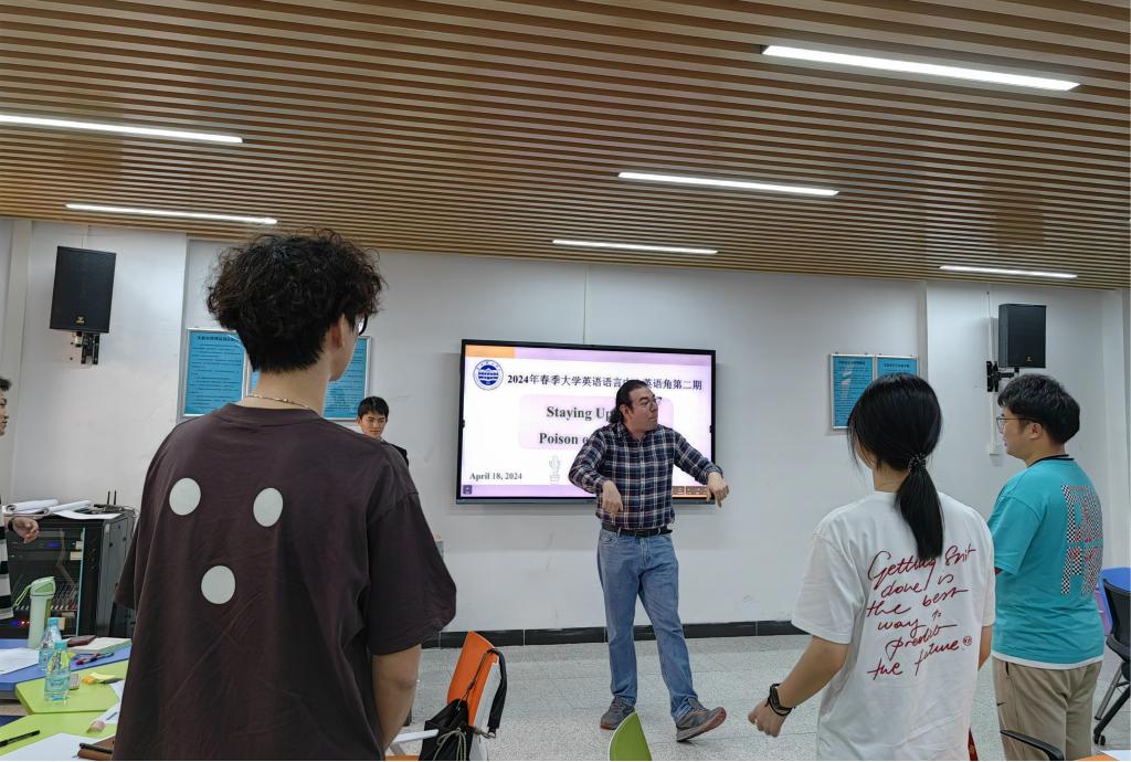 英语角邀请了两位外教和三位有留学经历的英语老师,为学生带来了精彩纷呈的语言学习体验。他们致力于培养学生英语口语表达能力,让学生在讨论中学习用英语表达观点、听取他人意见、进行跨文化交流。同时,教师们引导学生了解不同文化对待工作与休息的态度,培养他们的时间管理能力和健康意识。外教Andrew开展了破冰游戏。充满热情的互动让现场活力满满。