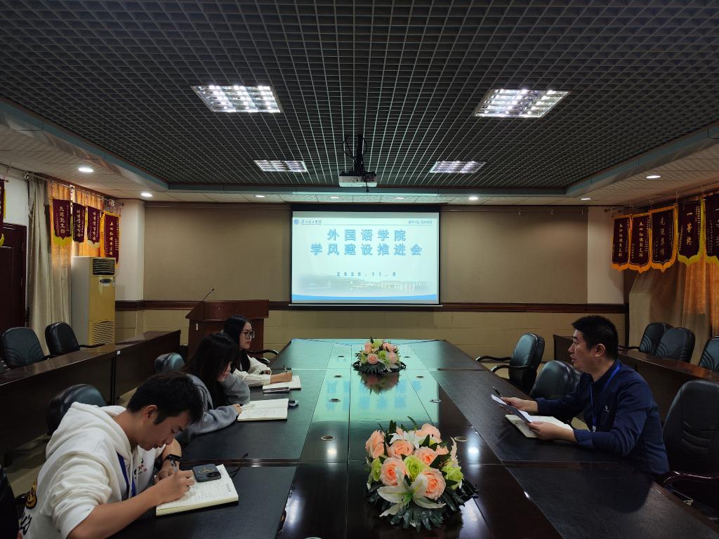 为落实学校相关工作要求,进一步强化课堂育人实效,持续推进学风建设,2025年11月3日上午,外国语学院在7-301召开学风建设推进会。外国语学院党总支副书记蔡俊及全体辅导员参会,围绕学生课堂行为规范、学习状态提升等关键议题展开深入研讨,凝聚育人合力。