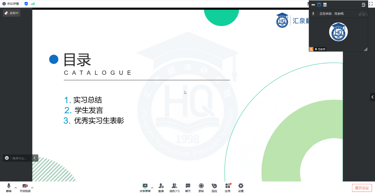 10月16日,汇泉翻译公司联合校内导师,为首批参与实习的九位同学隆重举办线上实习总结会,为期四周的实习之旅画上圆满句号。